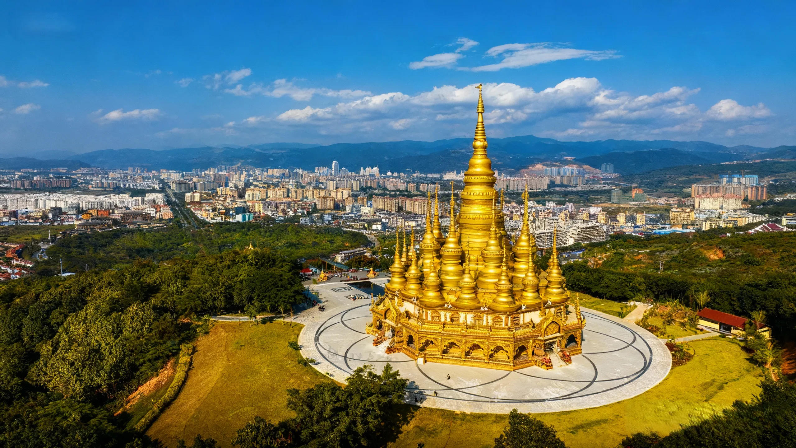 沿三千级台阶攀行,金塔在阳光下璀璨夺目。整座景洪城在脚下铺展。这一路攀登,洗去浮华,寻得内心的片刻宁静。