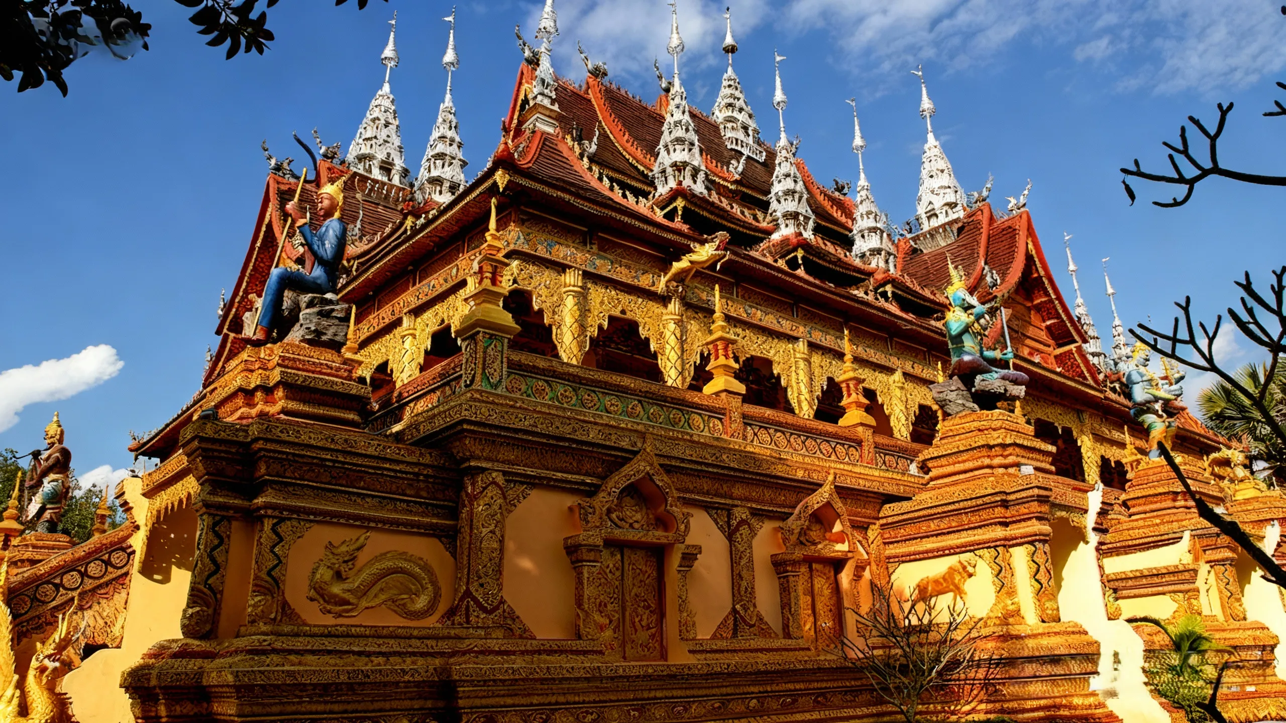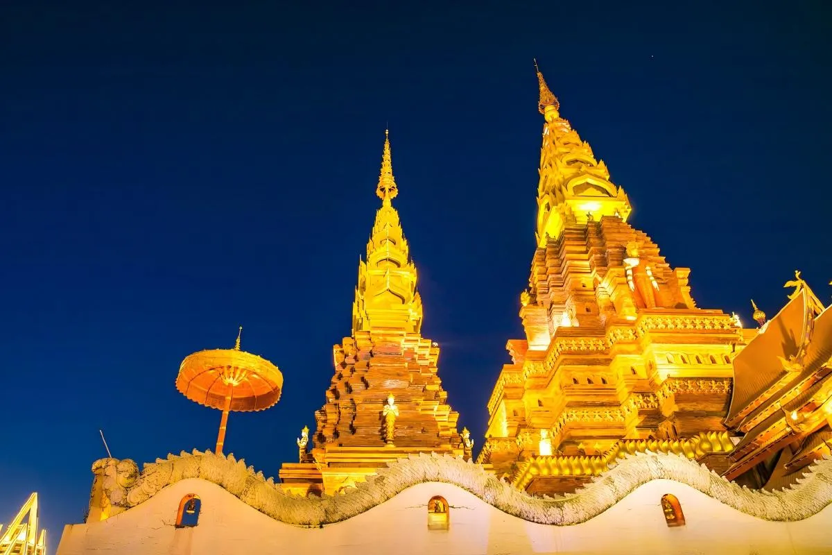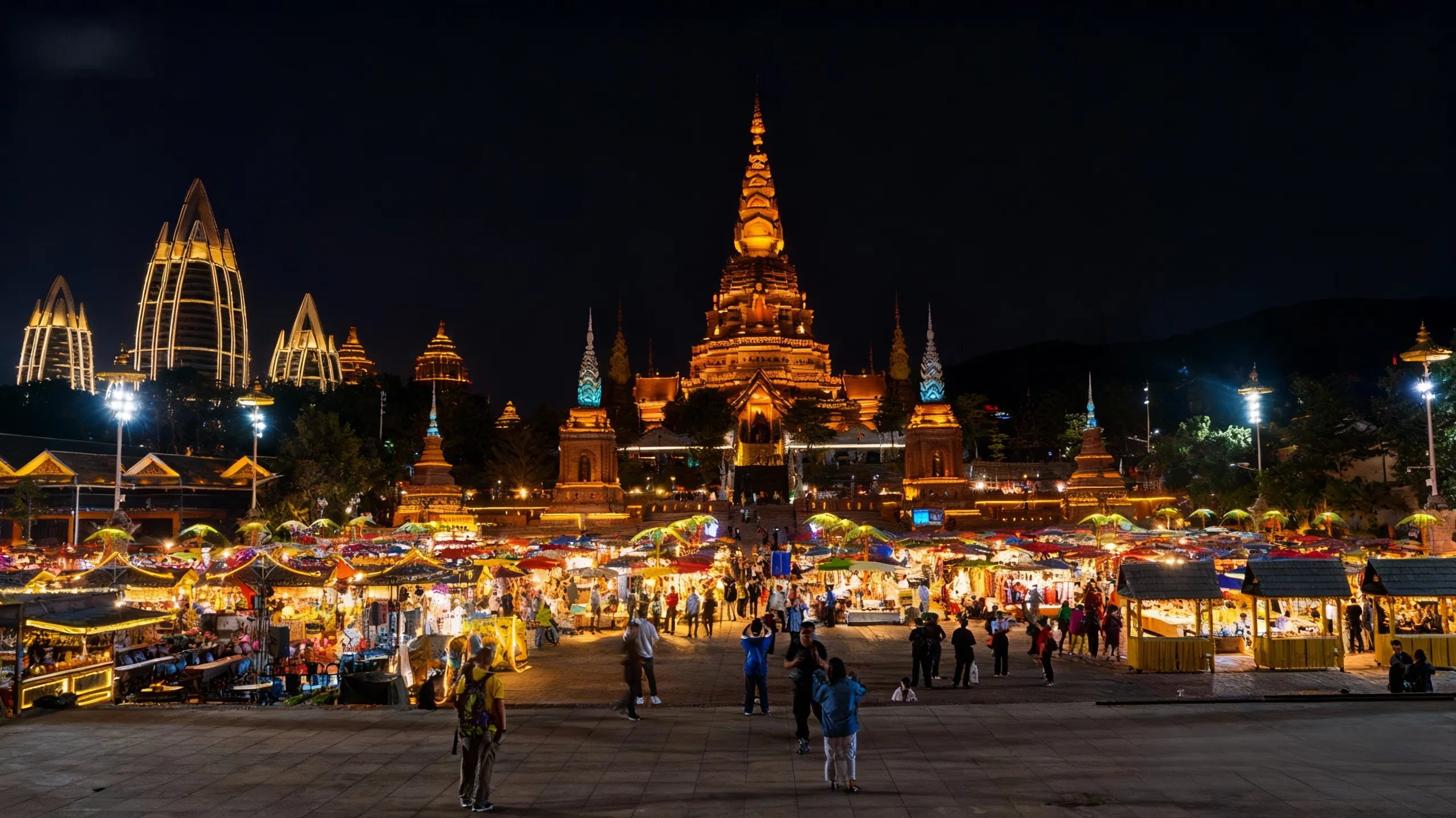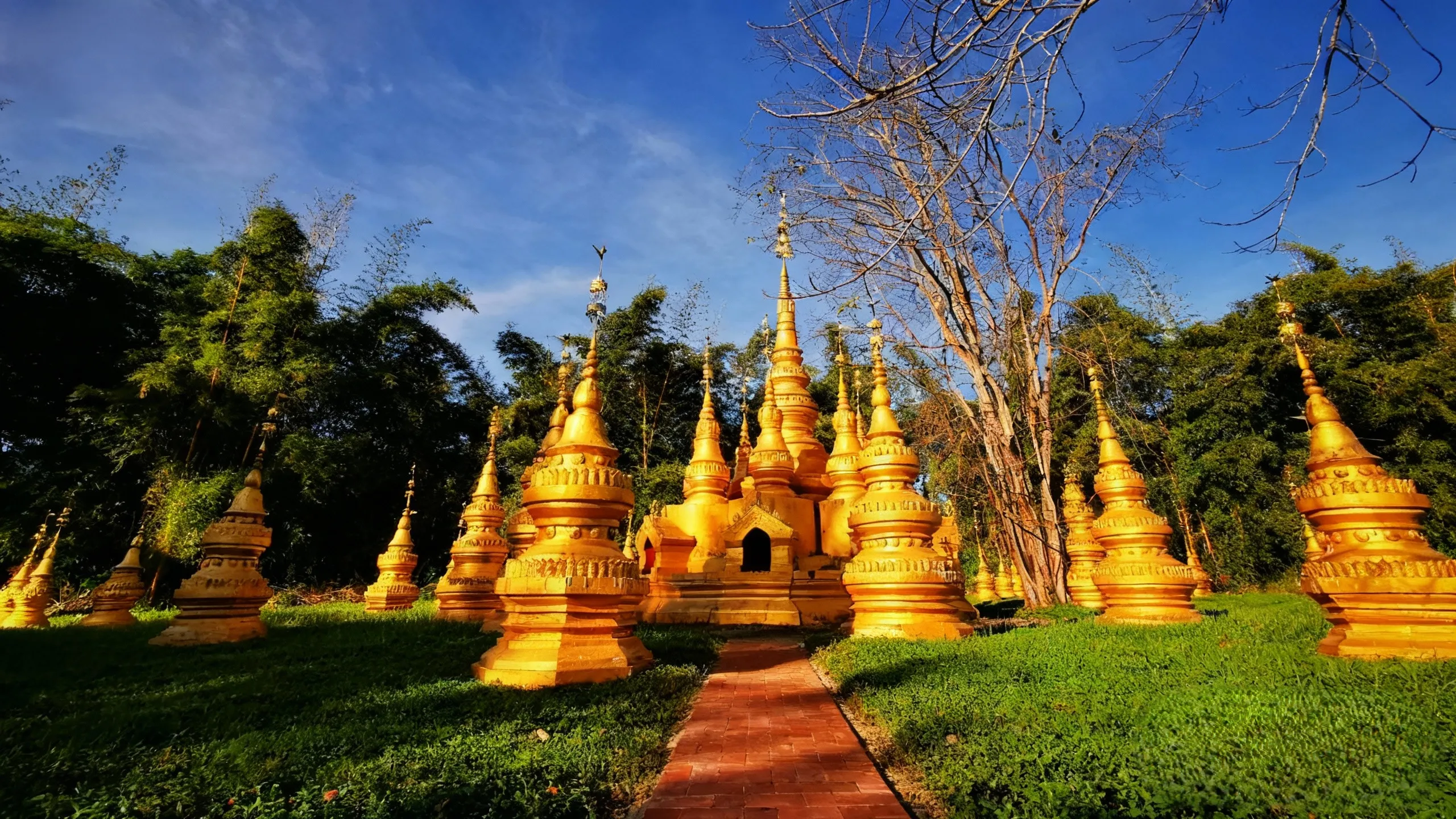 傍晚时分,当日头渐柔,我们走进这座"九塔十二寨"。金塔在夕阳下泛着暖光,白色佛寺与傣楼错落有致。不妨先租套傣装,让裙摆随风轻扬,在塔寺间定格第一张版纳记忆。