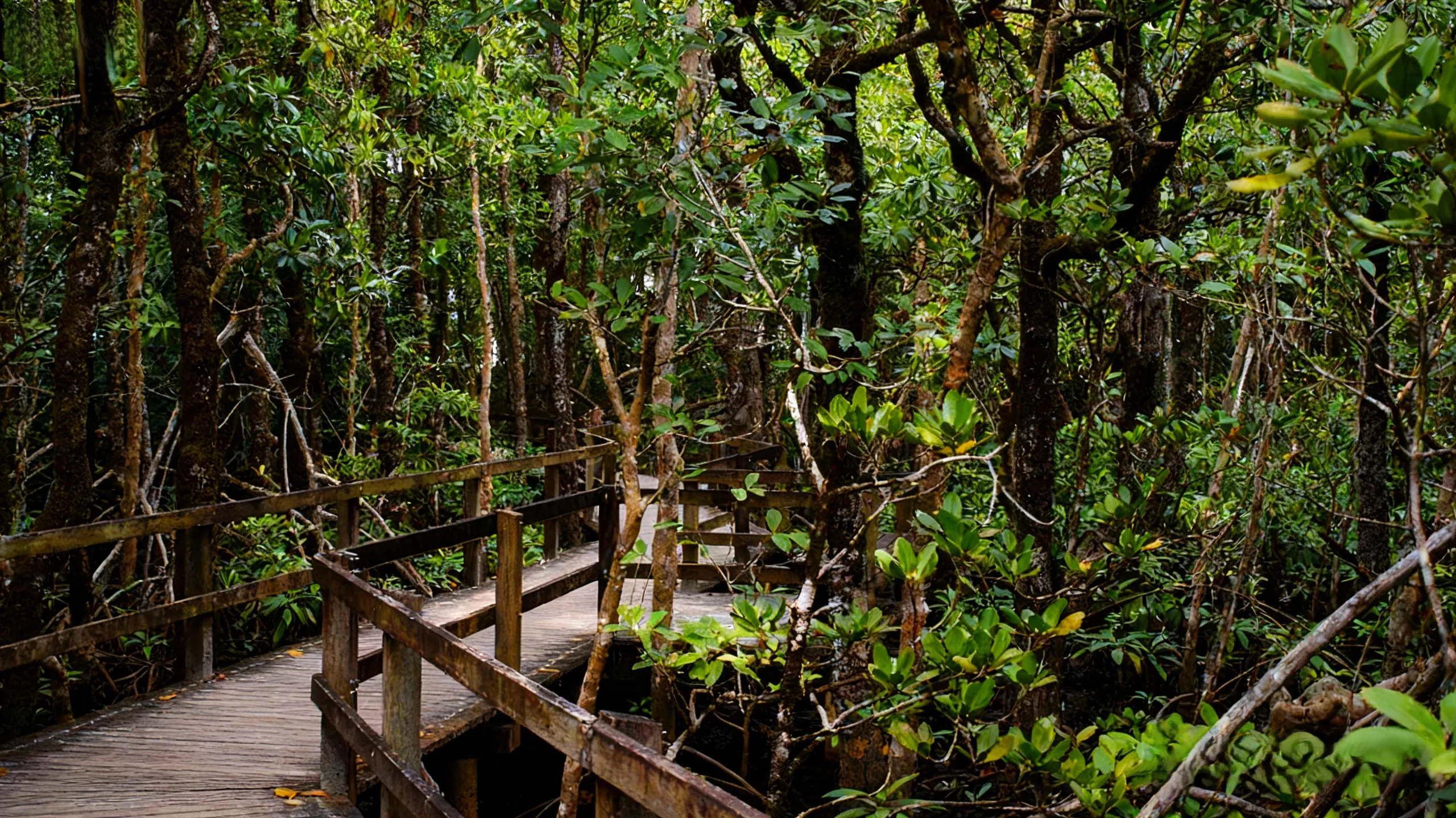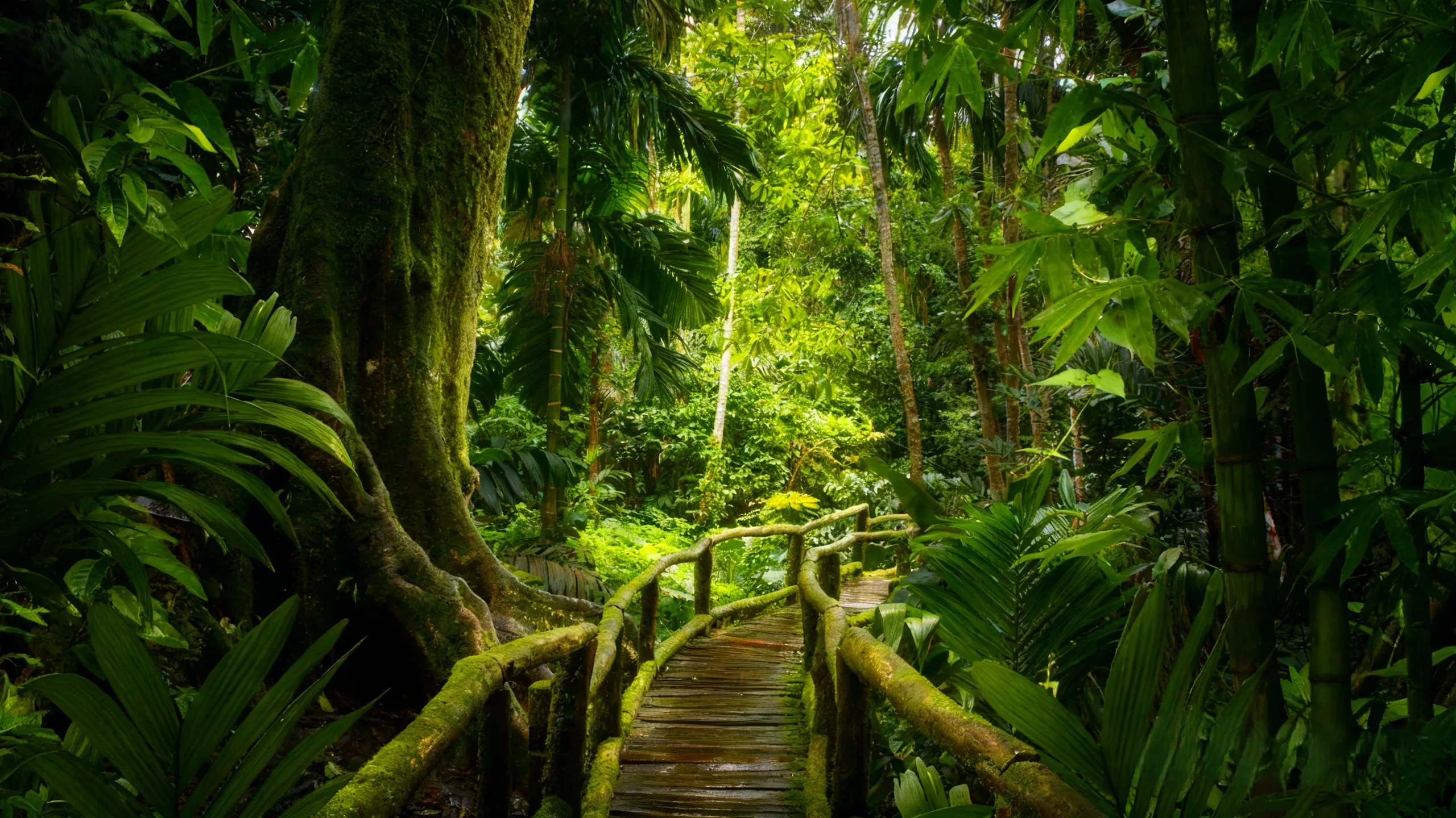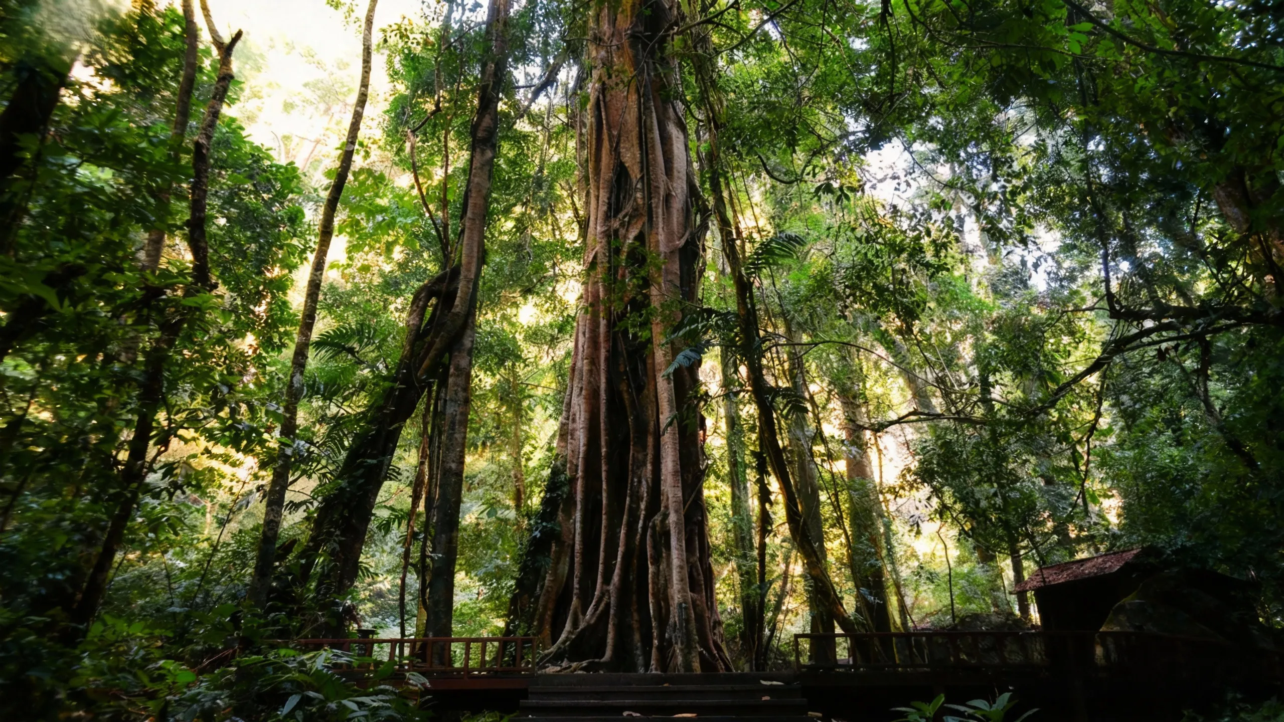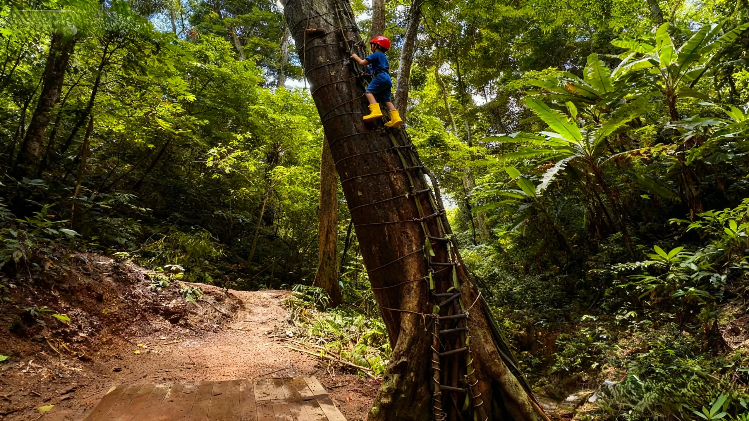 这里的雨林展现了极原始的生命力。雨林乔木在争夺阳光,湿热缠绕着我们的脚踝,虫鸣鸟叫此起彼伏。我们沿木栈道深入,每一步都踏在生态演化的道路上,去探究热带植物生存的智慧——奋力向上?