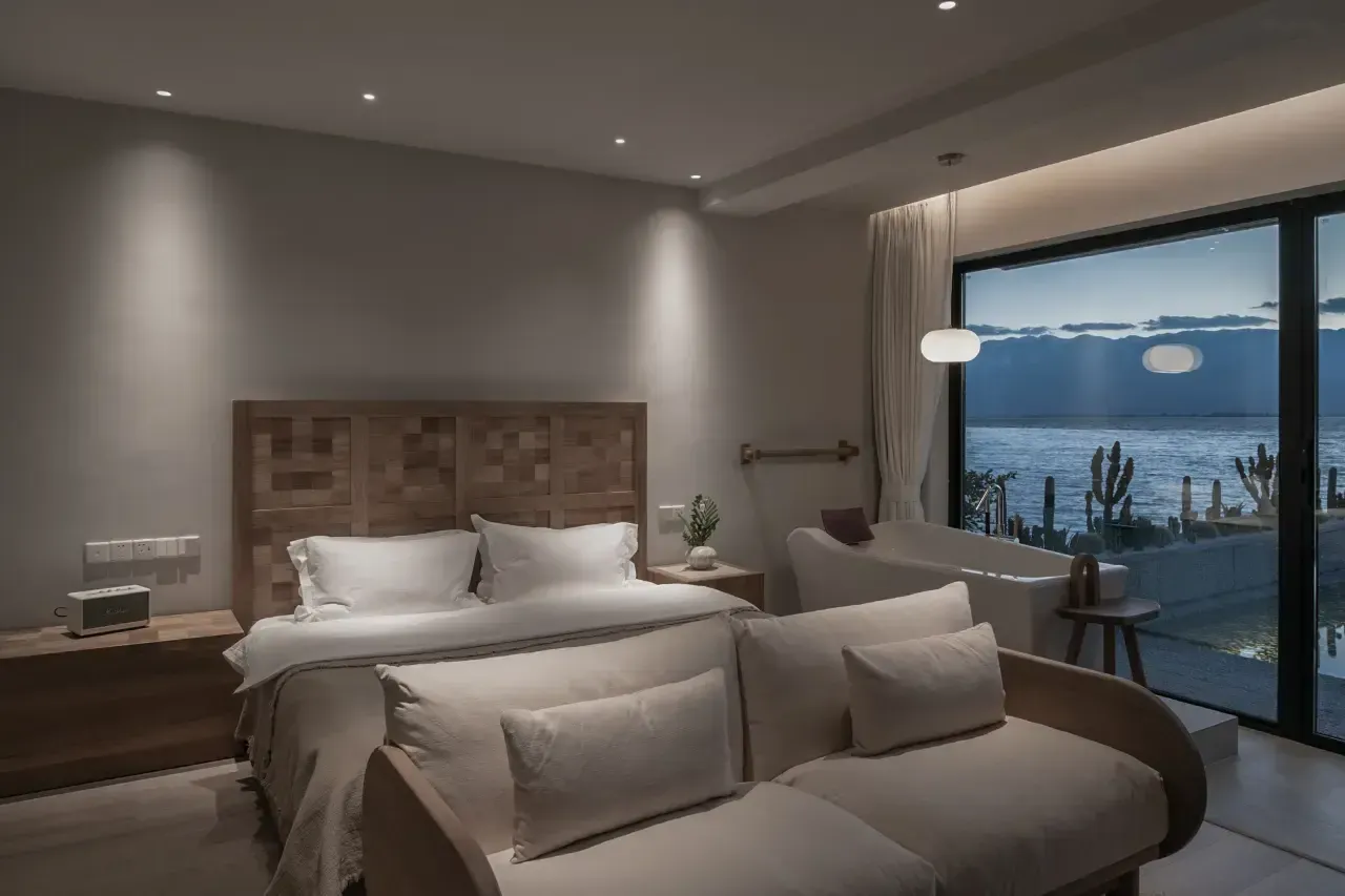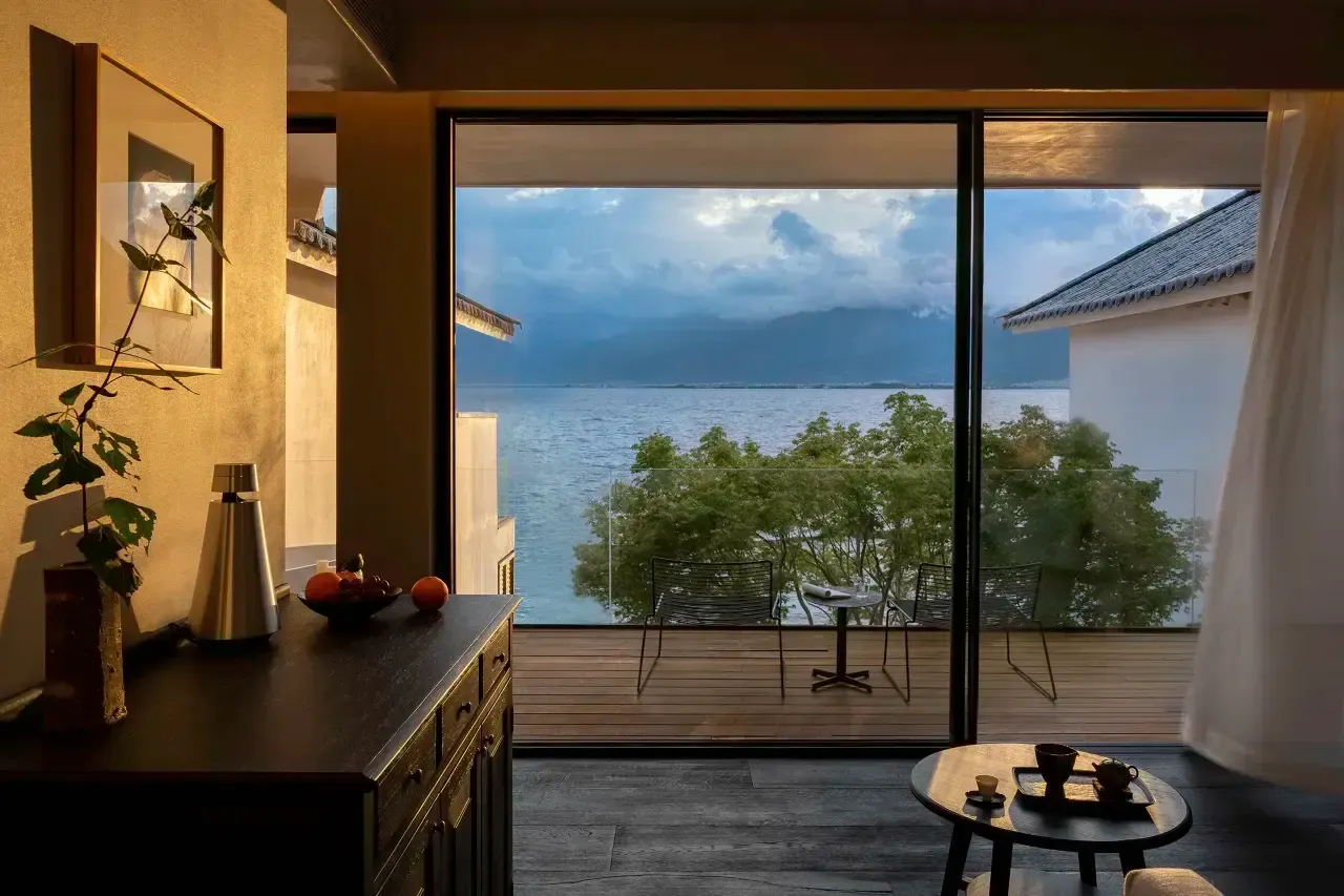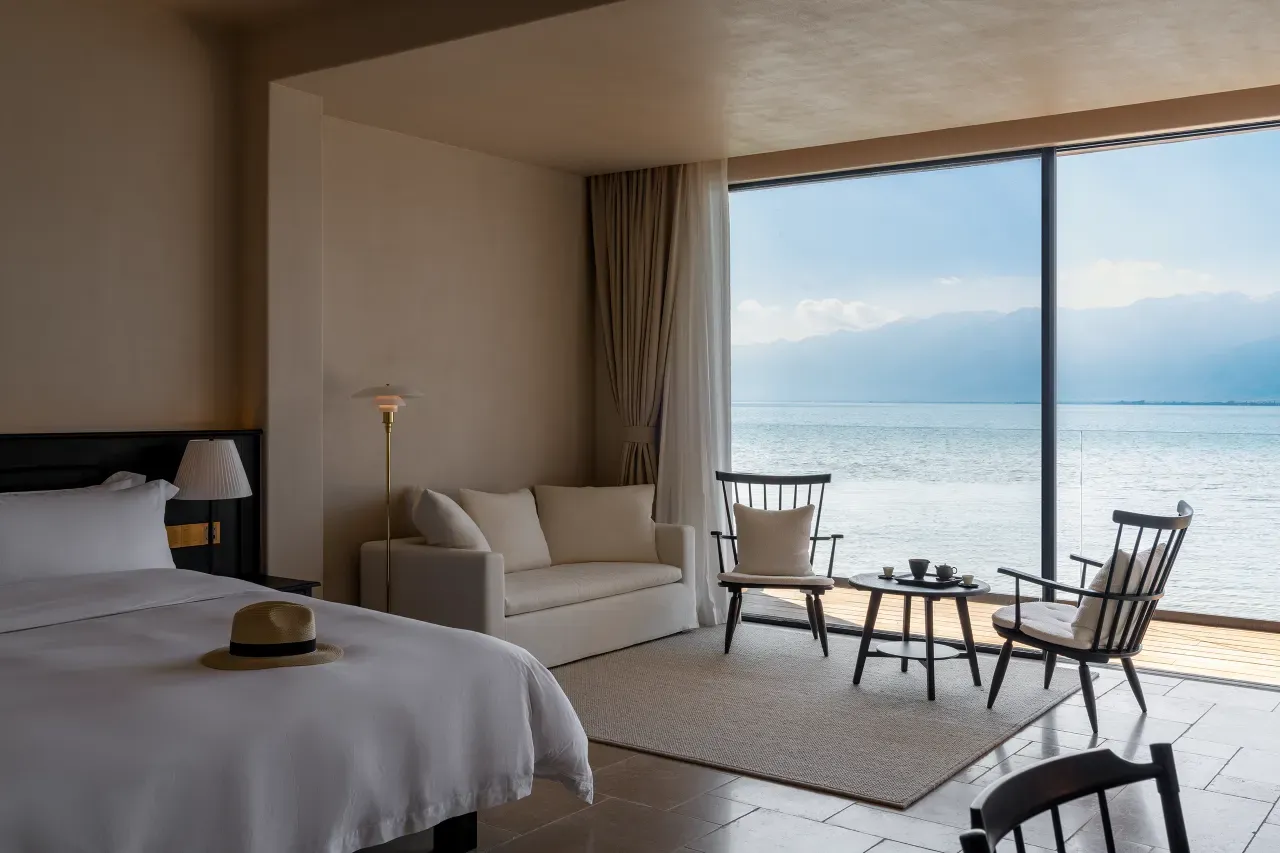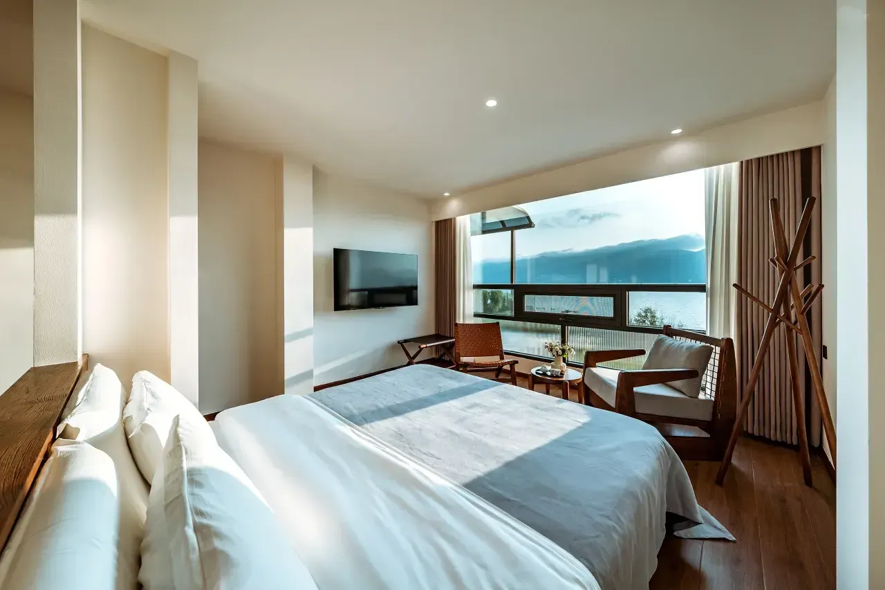 直面洱海,极简主义与自然融合。客房最小42㎡左右,落地窗引景入室。在晨光将洱海染成粉金色的时刻,于私密空间独享苍洱第一缕阳光的馈赠。