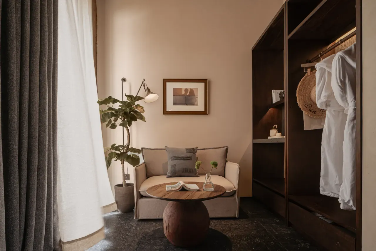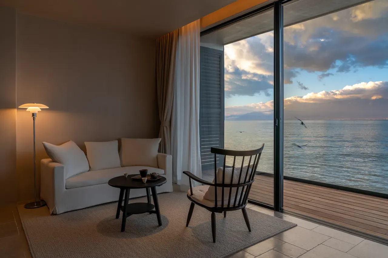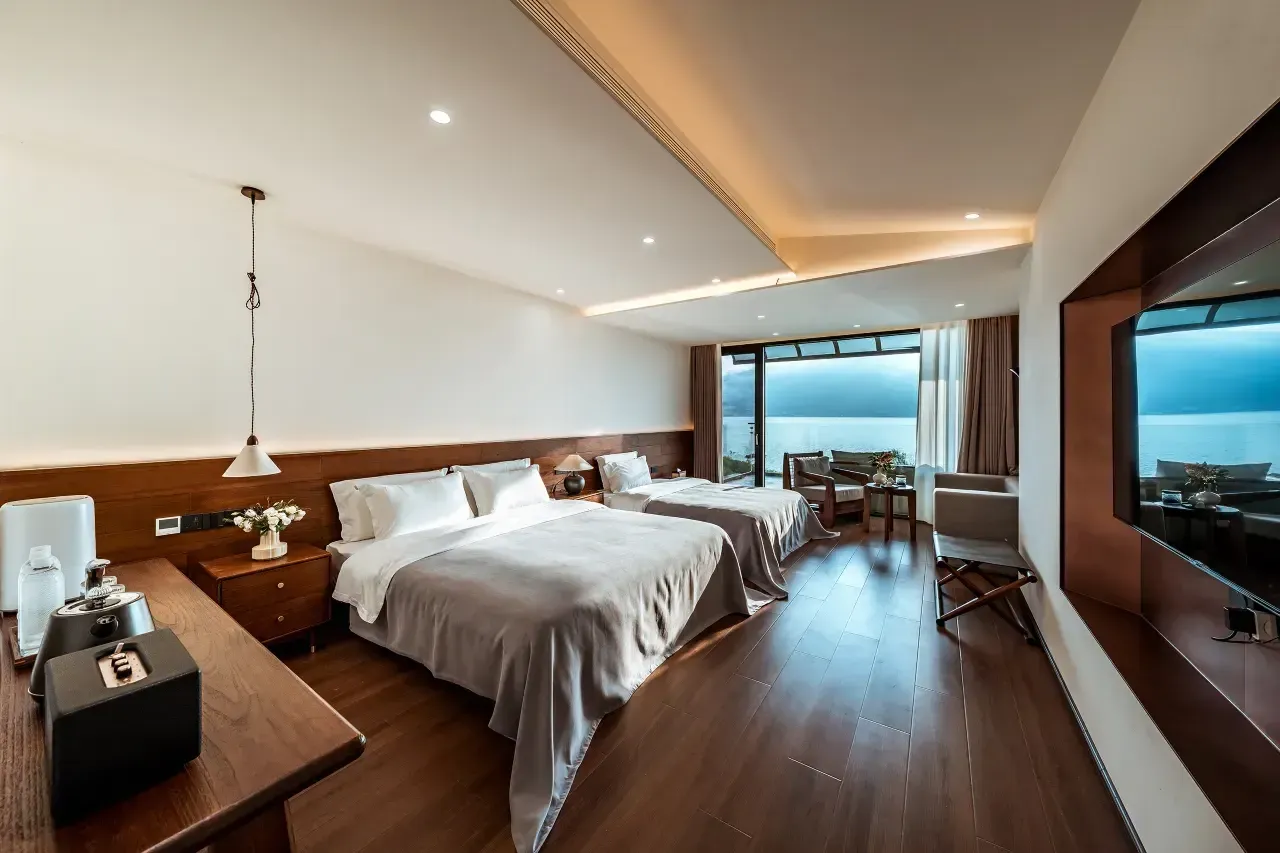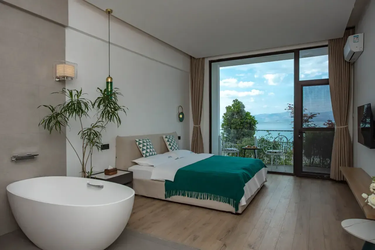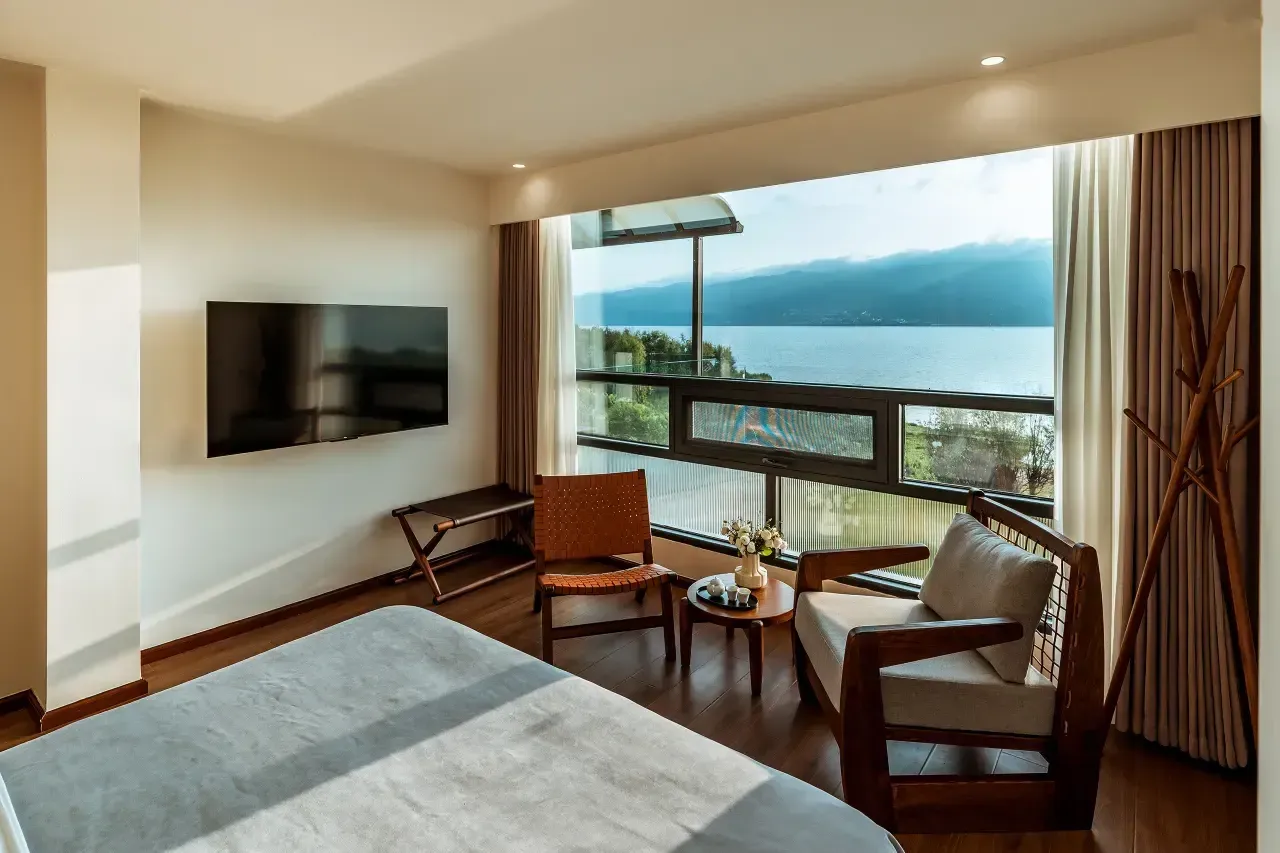 直面洱海,极简主义与自然融合。客房最小42㎡左右,落地窗引景入室。在晨光将洱海染成粉金色的时刻,于私密空间独享苍洱第一缕阳光的馈赠。