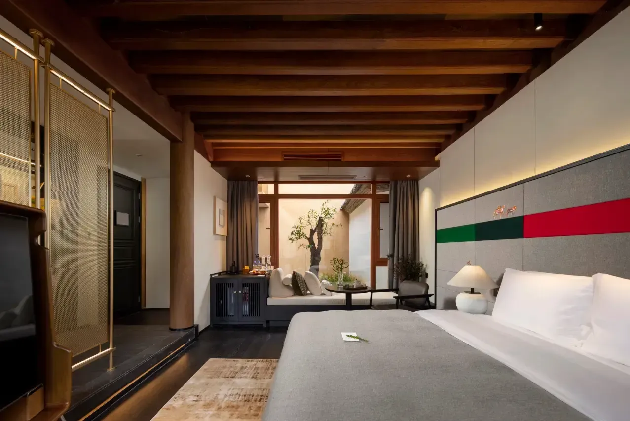 现代设计与白族传统相融,主打舒适与美学平衡。房间最小35㎡左右,床品温馨。当月光漫过黑惠江,在院落里仰望星空,感受被时光善待的温柔。