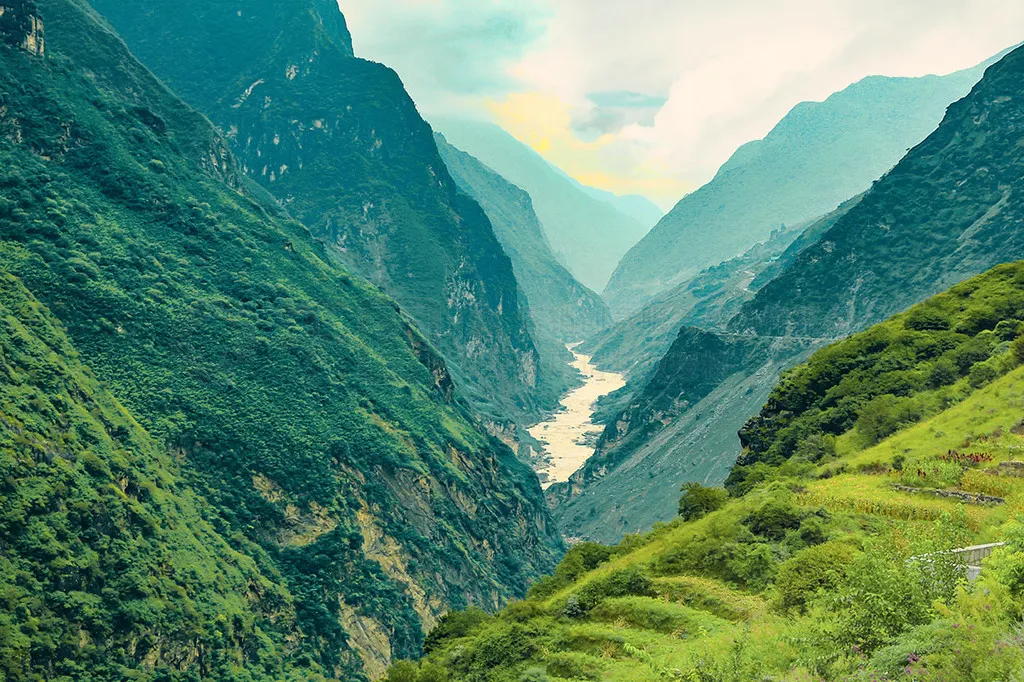 金沙江在玉龙、哈巴两大雪山的夹峙下奔腾咆哮,江面最窄处仅30余米。上虎跳的惊涛骇浪声震数里,中虎跳的"一线天"险峻异常,而高路徒步线则是观赏峡谷全景的最佳位置,让人真切感受自然的伟力。