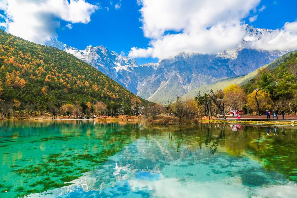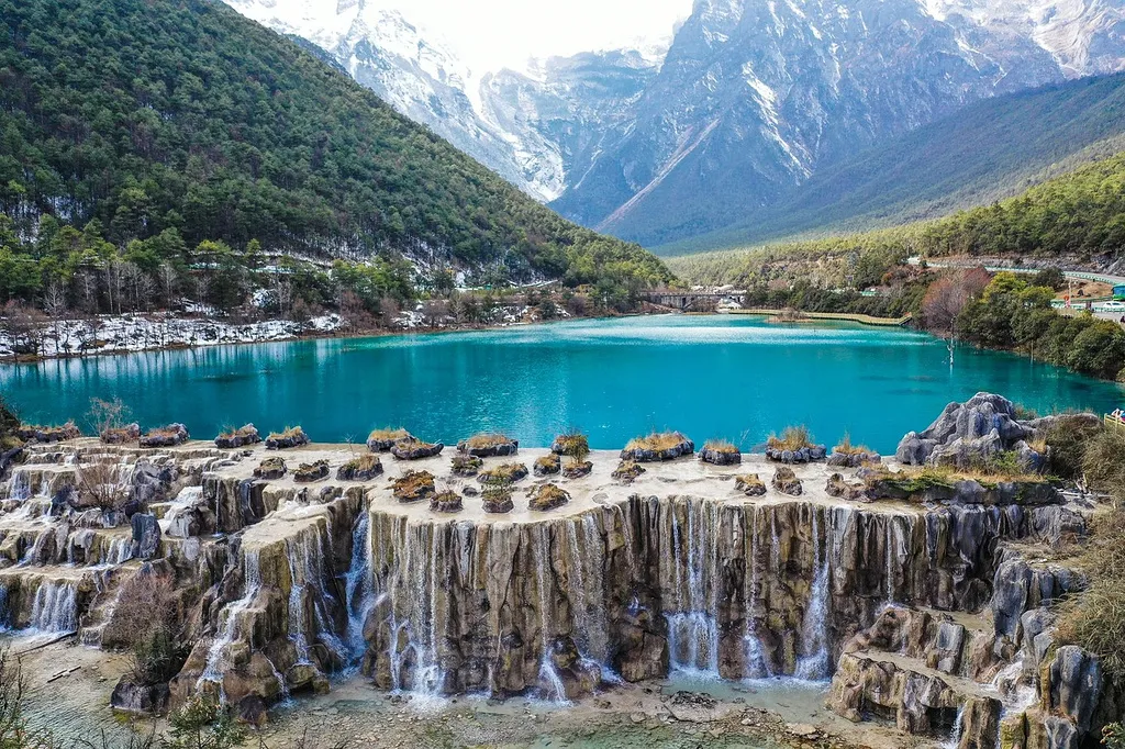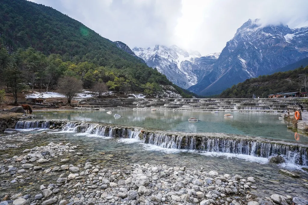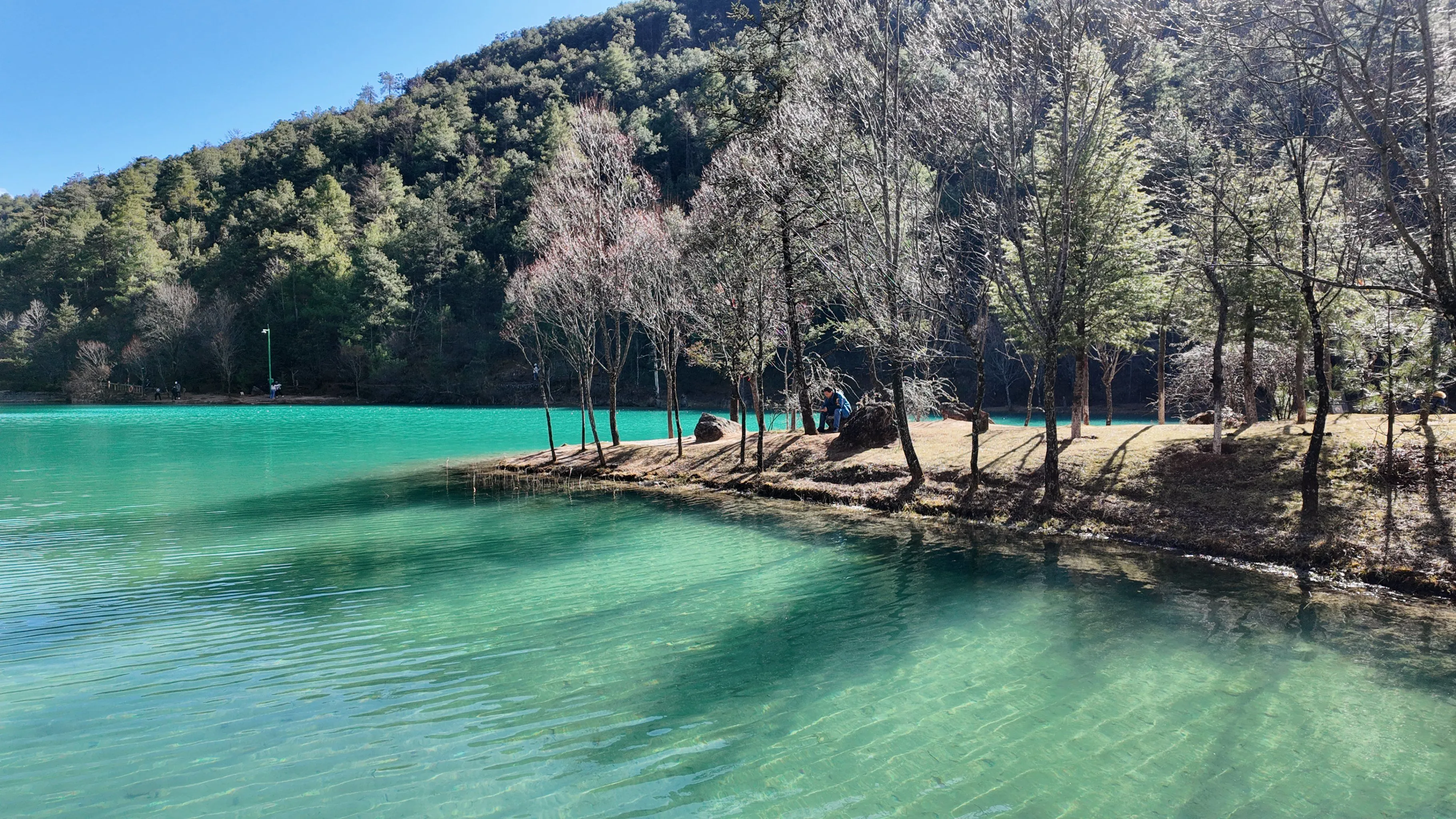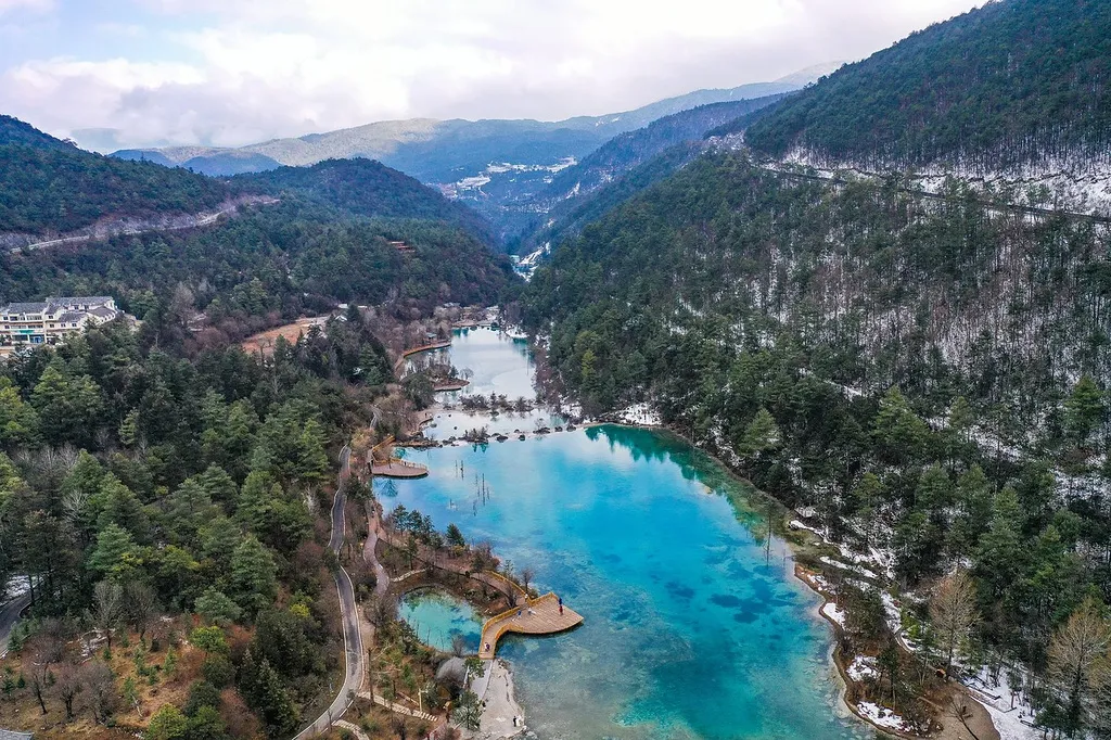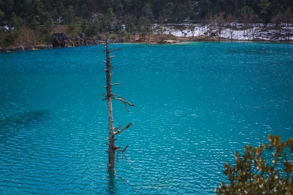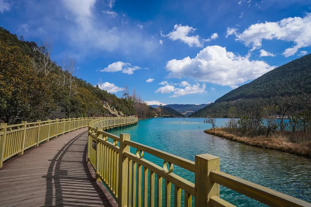 源自玉龙雪山的冰川融水,因富含铜离子而呈现梦幻的蓝绿色。四个连缀的湖面如同镶嵌在雪山脚下的翡翠,晴天时色泽艳丽,雨天又化作乳白,当地人说,在这里捧一掬湖水洗手,可以对望见未来的模样。