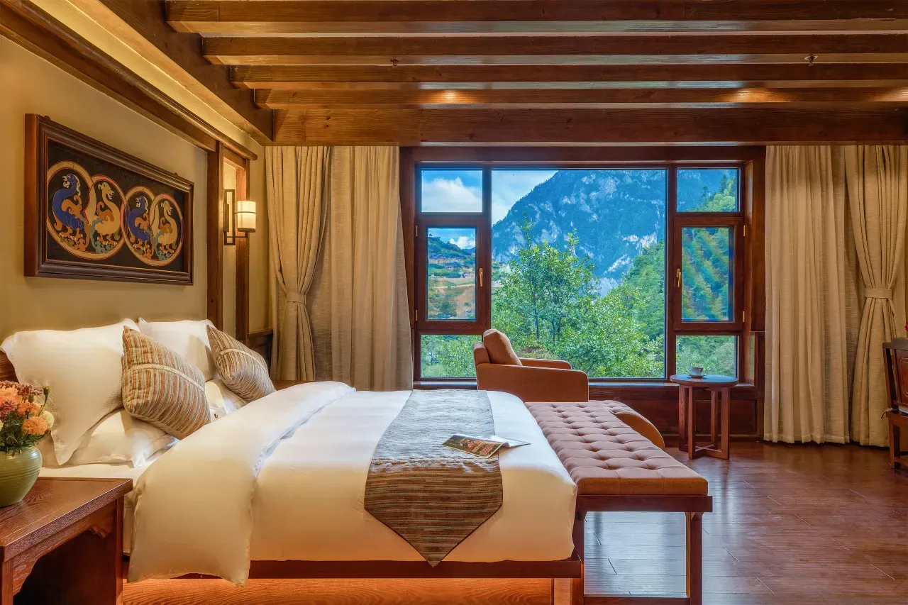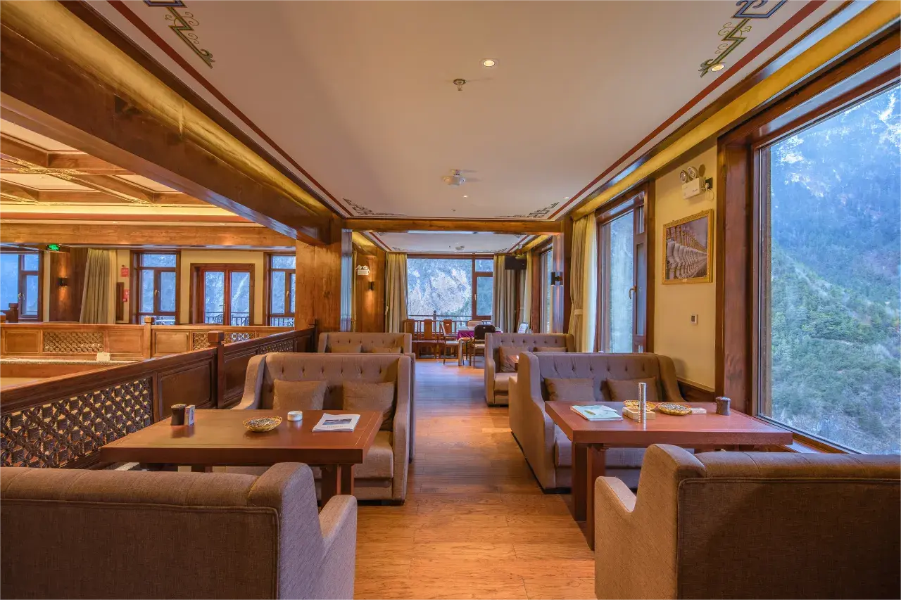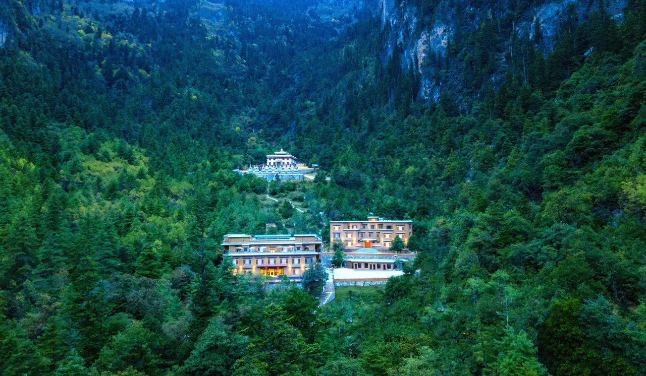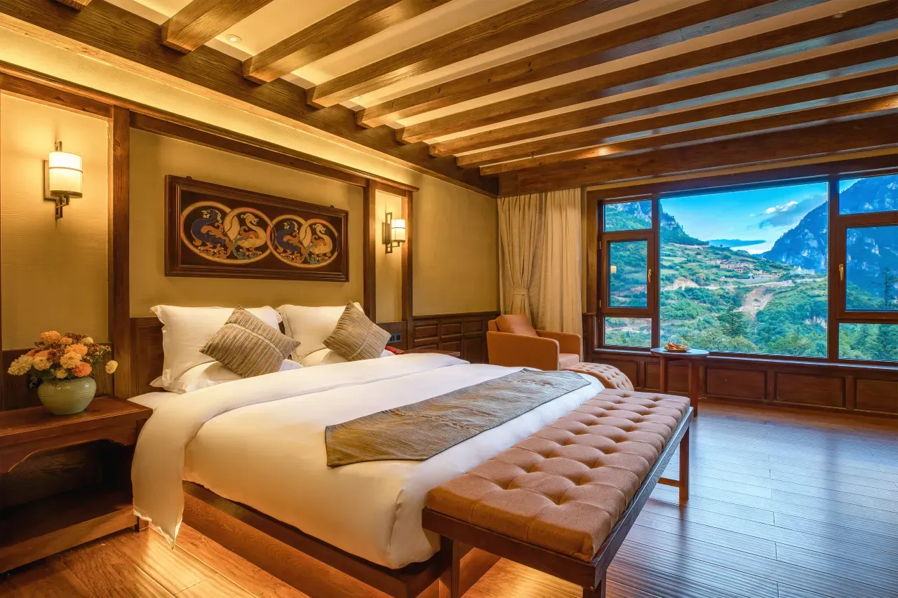 镶嵌于巴拉格宗垂直崖壁的奇迹建筑,践行"人神共居"的藏式哲学。55㎡起客房均带270°观景窗与天然温泉泡池。晨起在悬空餐厅享用藏式早餐时,岩羊群常从窗外岩壁轻盈掠过;黄昏时分沿私人步道抵达秘境瀑布,在经幡环绕中感受"山即是佛"的顿悟时刻。