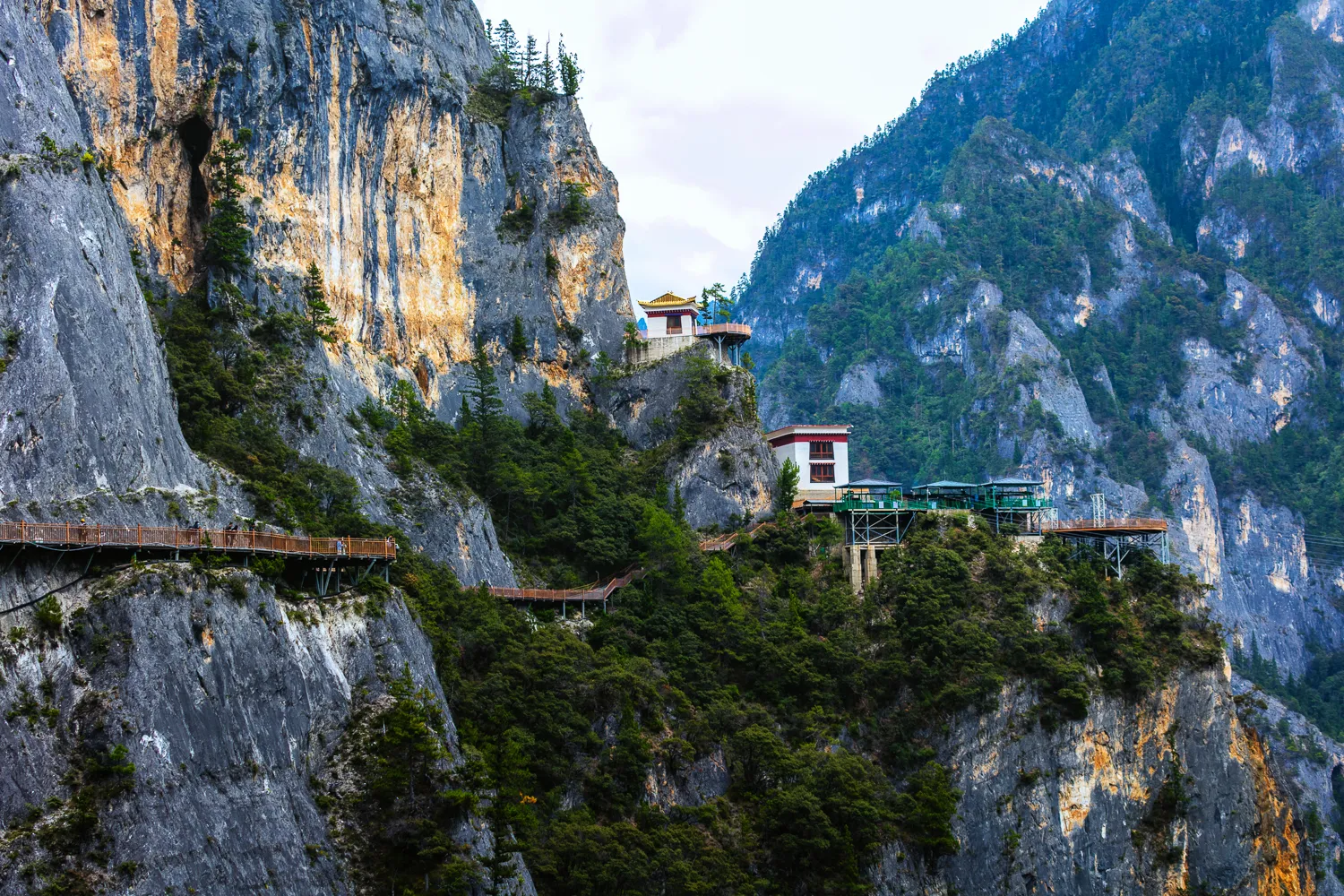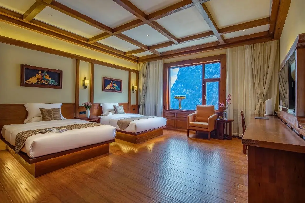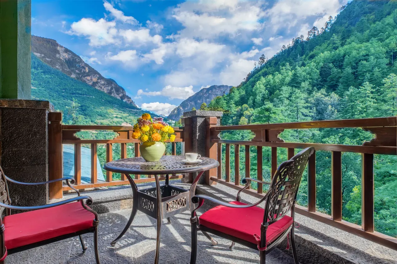镶嵌于巴拉格宗垂直崖壁的奇迹建筑,践行"人神共居"的藏式哲学。55㎡起客房均带270°观景窗与天然温泉泡池。晨起在悬空餐厅享用藏式早餐时,岩羊群常从窗外岩壁轻盈掠过;黄昏时分沿私人步道抵达秘境瀑布,在经幡环绕中感受"山即是佛"的顿悟时刻。