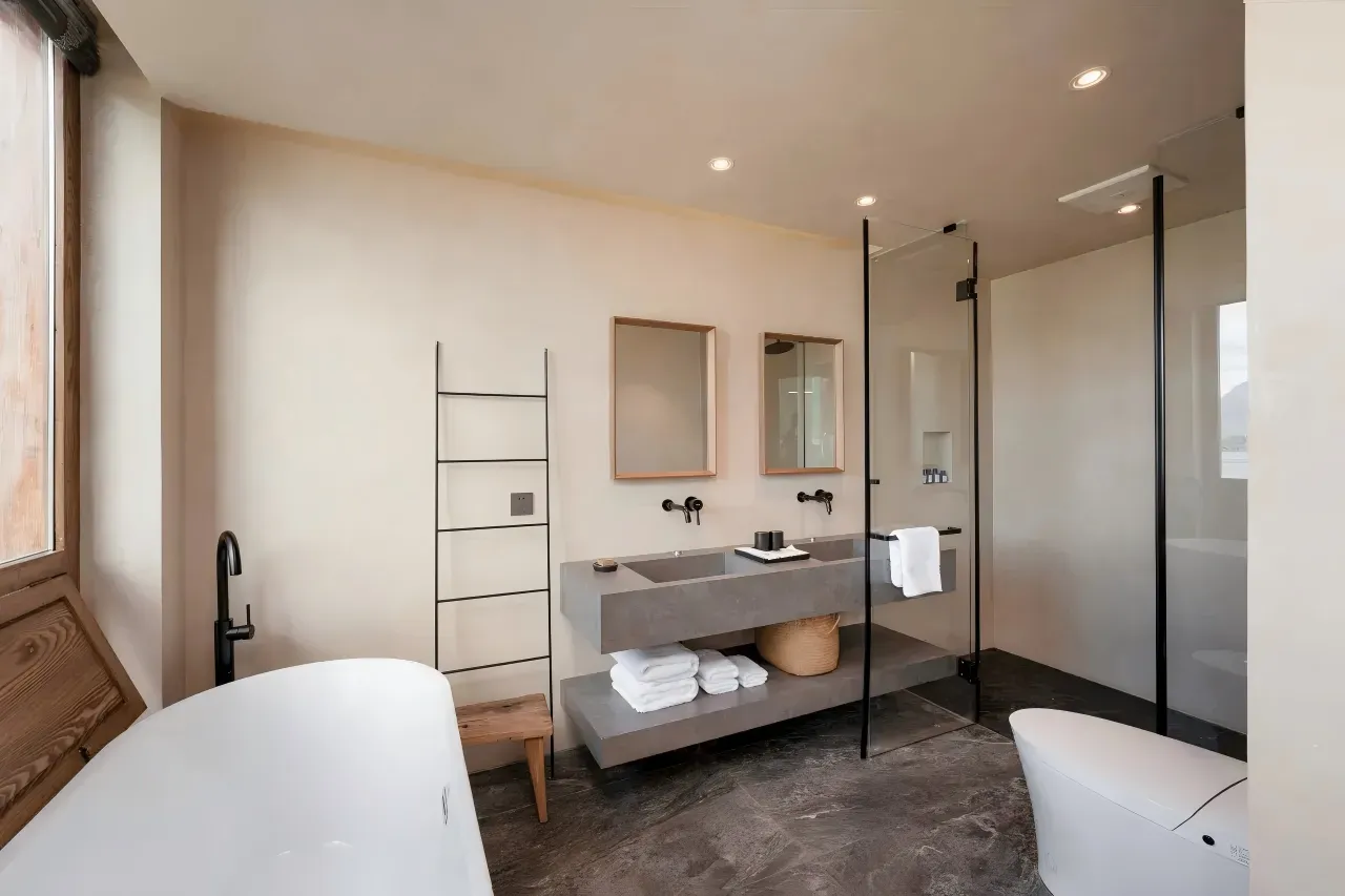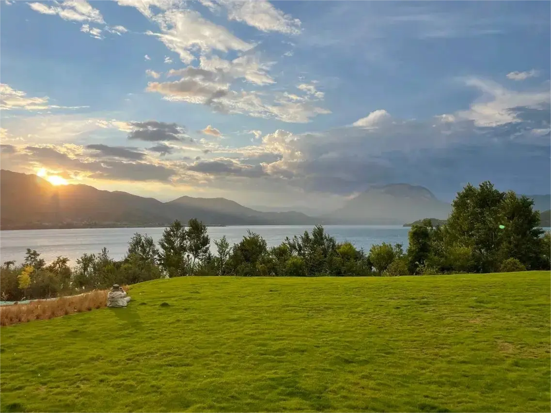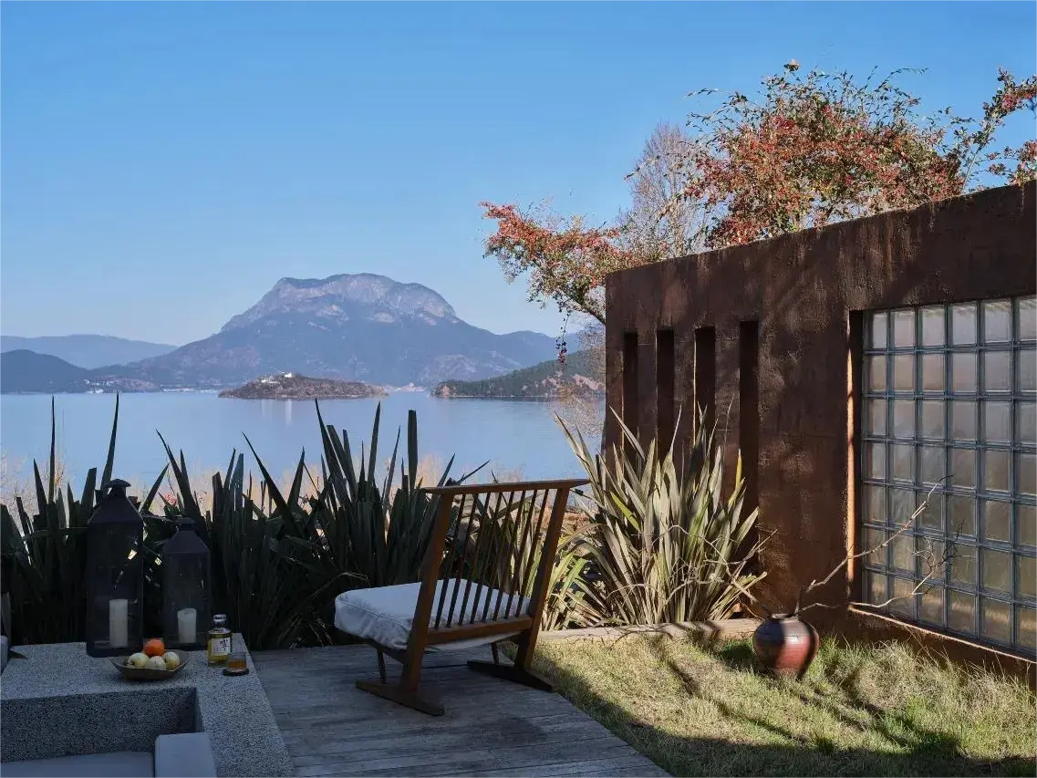 悬浮于泸沽湖悬崖的极简主义作品,主打"山水与人的精神共鸣"。60㎡左右的客房三面环景,智能家居与原创家具塑造当代隐逸。在悬挑露台享用漂浮下午茶时,格姆女神山倒影触手可及;夜幕降临时壁炉自动燃起,透过整面玻璃墙见证星辰与湖灯在墨色水面上连成璀璨星轨。