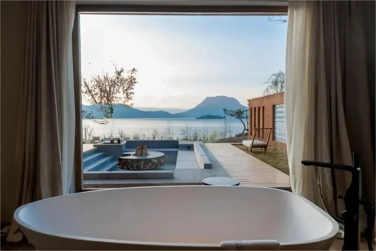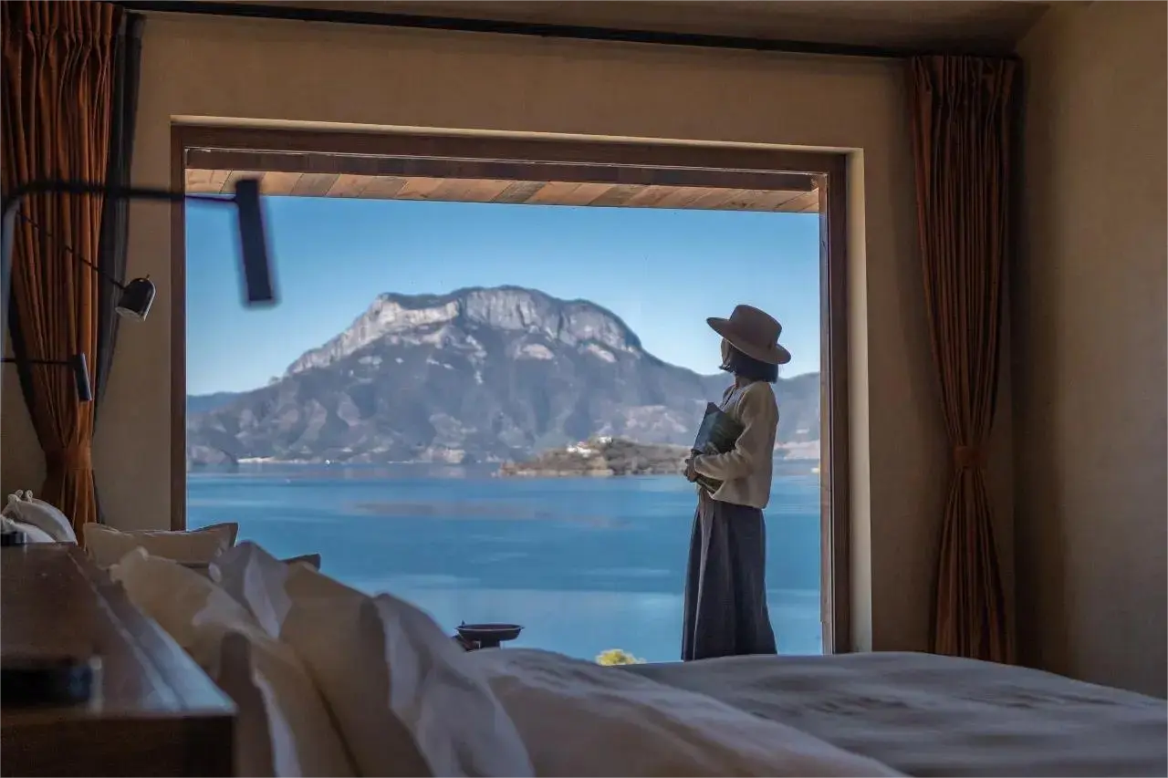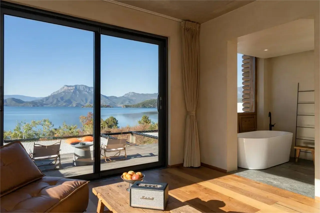 临水而建的侘寂风建筑,以"与女儿国对话"为设计哲学。客房(45㎡左右)配备地暖与观星天窗,戴森吹风机与帕尔玛之水洗浴品彰显品质。晨起盘坐窗边看猪槽船划破湖面晨雾,午后在亲水平台喂食红嘴鸥,待星空满天后浸入临窗浴缸,恍若漂浮于银河与泸沽湖的交界处。