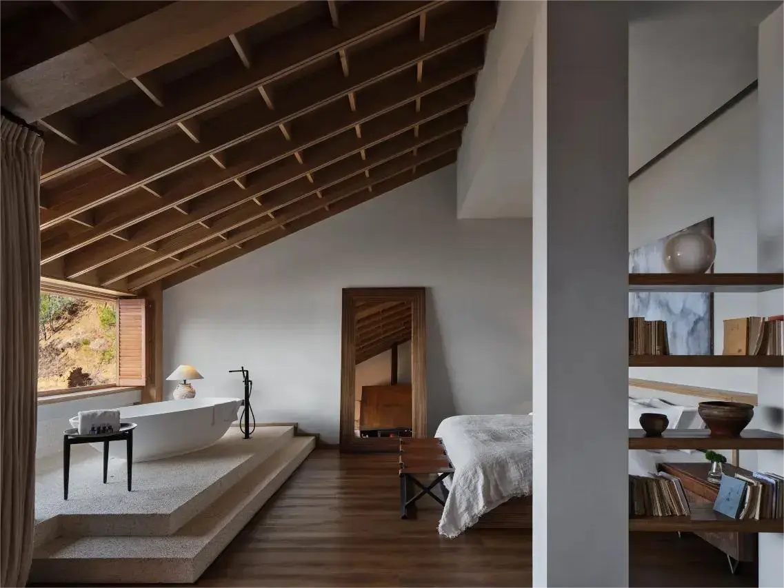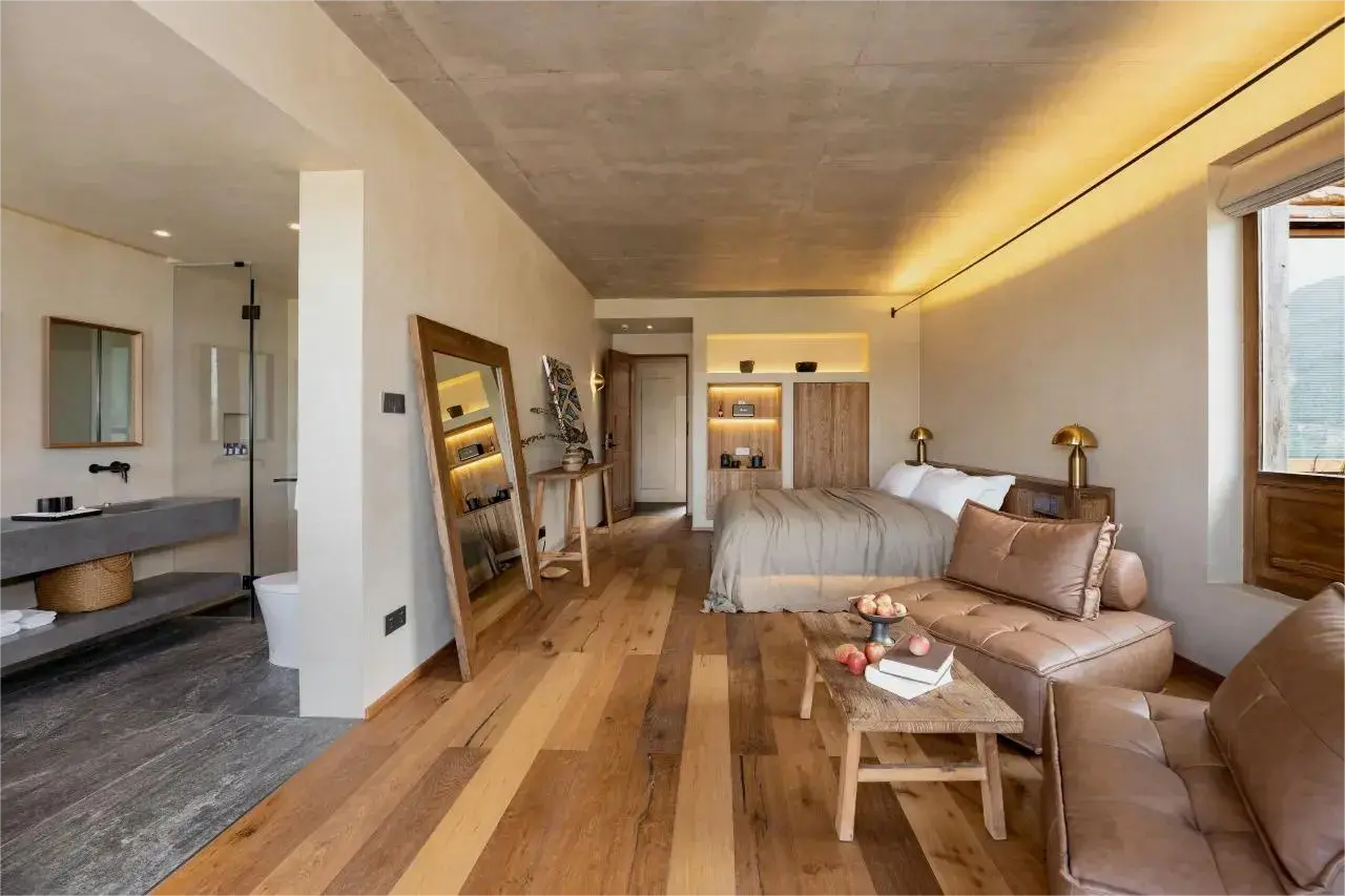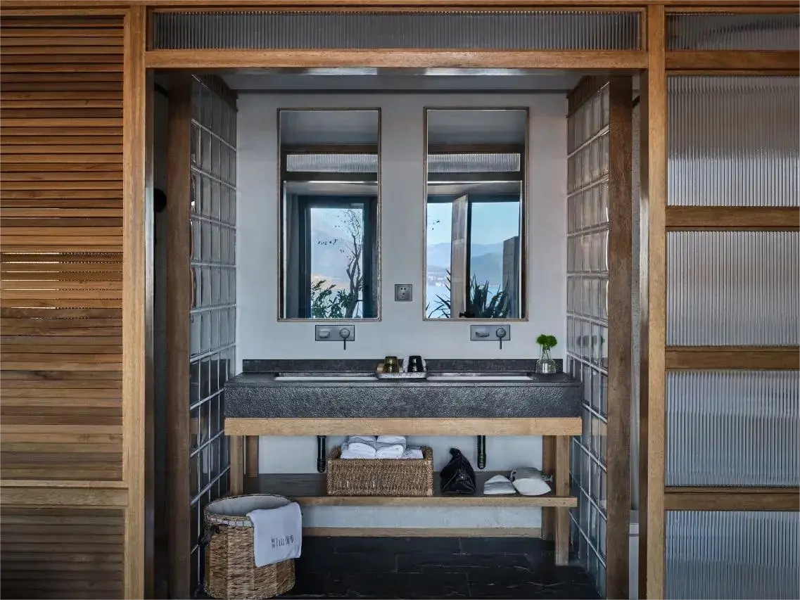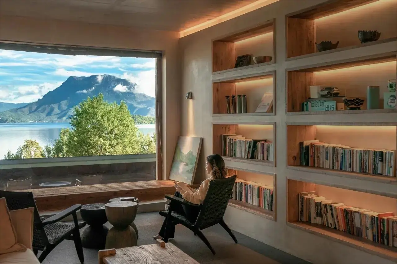 临水而建的侘寂风建筑,以"与女儿国对话"为设计哲学。客房(45㎡左右)配备地暖与观星天窗,戴森吹风机与帕尔玛之水洗浴品彰显品质。晨起盘坐窗边看猪槽船划破湖面晨雾,午后在亲水平台喂食红嘴鸥,待星空满天后浸入临窗浴缸,恍若漂浮于银河与泸沽湖的交界处。