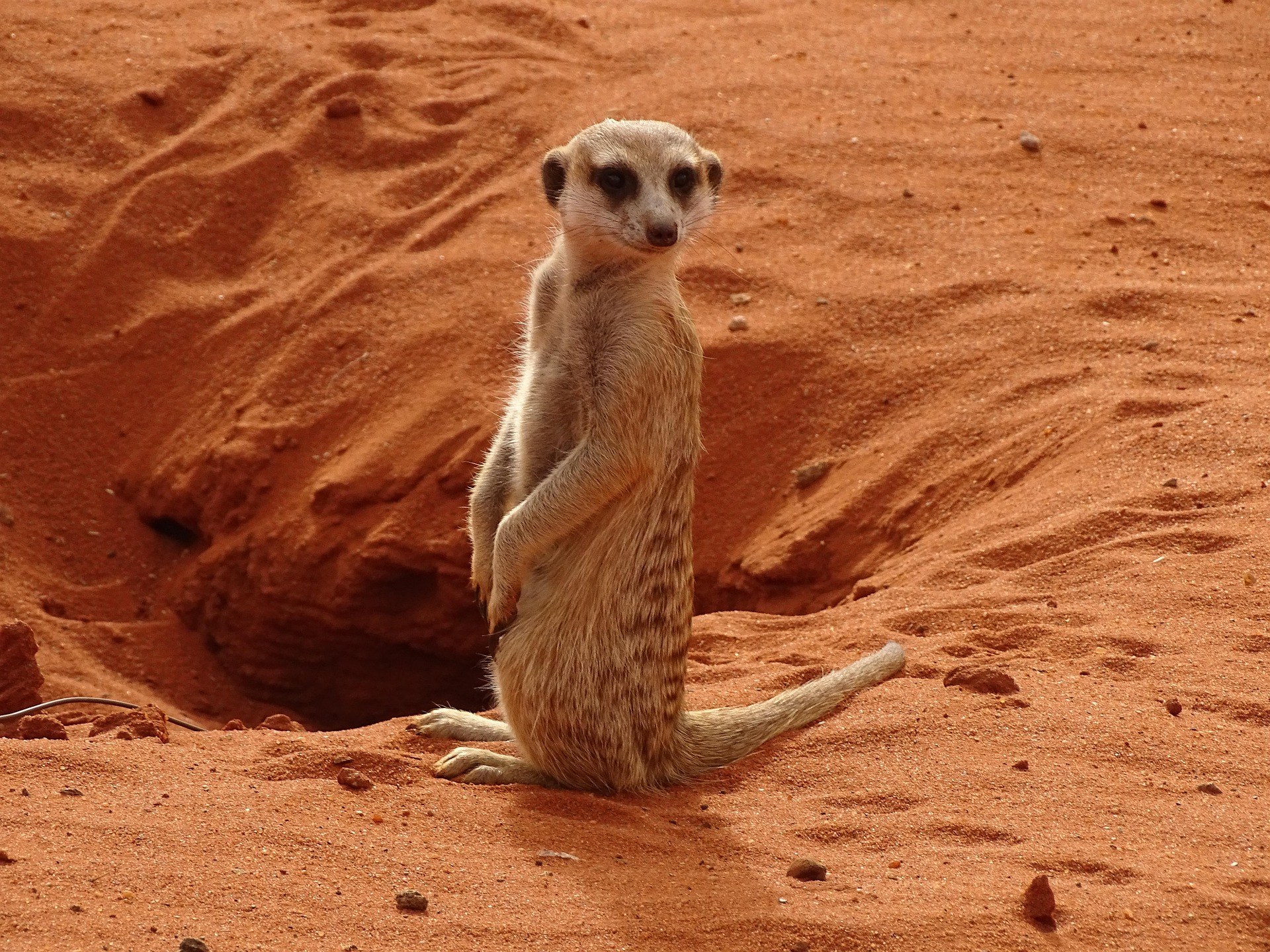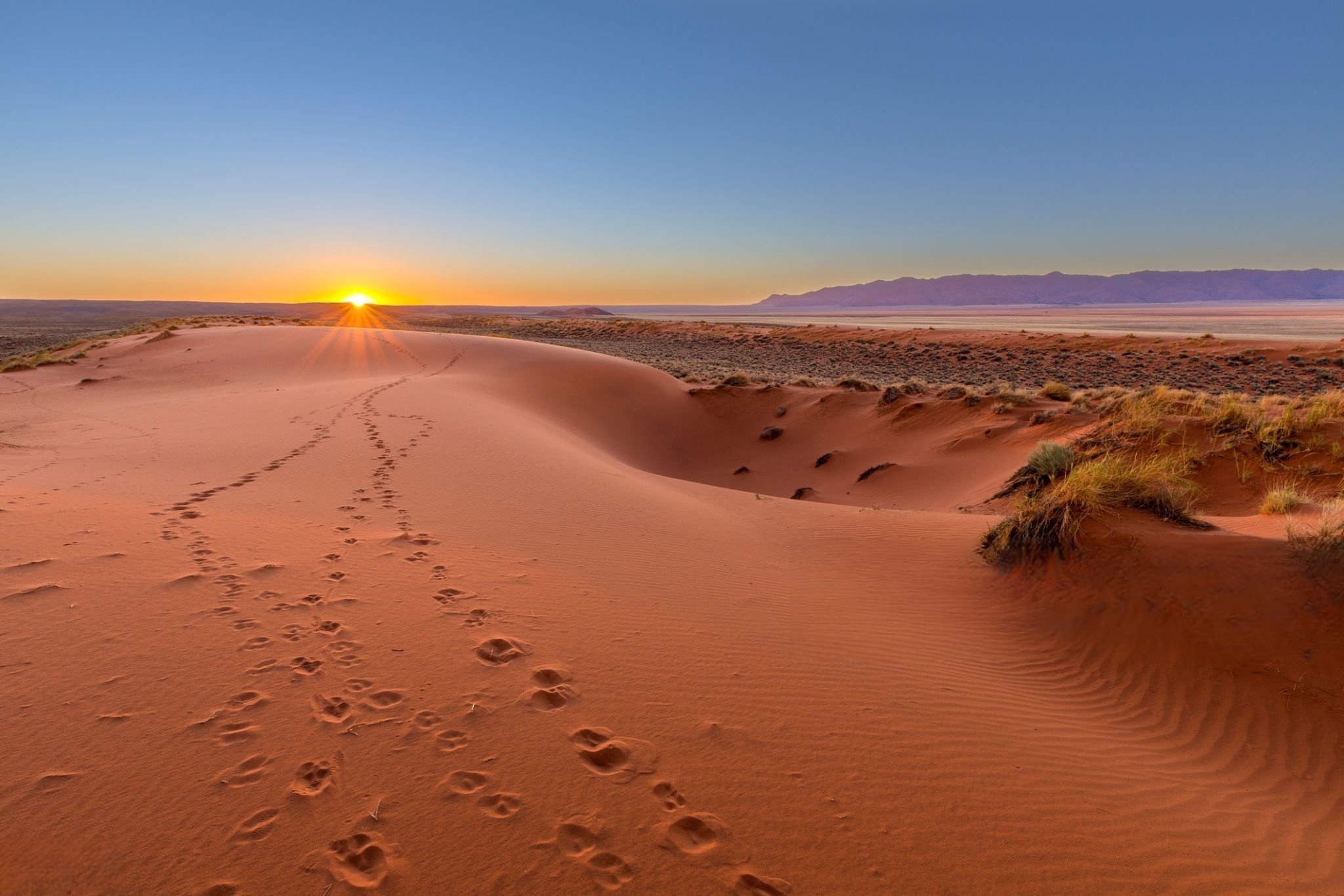 晨光初现的苏索斯维利沙漠,八百万吨红色沙粒在风中流动,形成地球上最古老的几何线条。死亡谷中枯死的骆驼刺树在龟裂的盐碱地上投下焦黑剪影,这些九百年前的遗骸依然保持着生命最后的姿态。当地向导用桑人传承的追踪术解读着沙丘上的动物足迹,在看似荒芜的沙海之下,金鼹鼠正在两米深的洞穴中躲避烈日。
