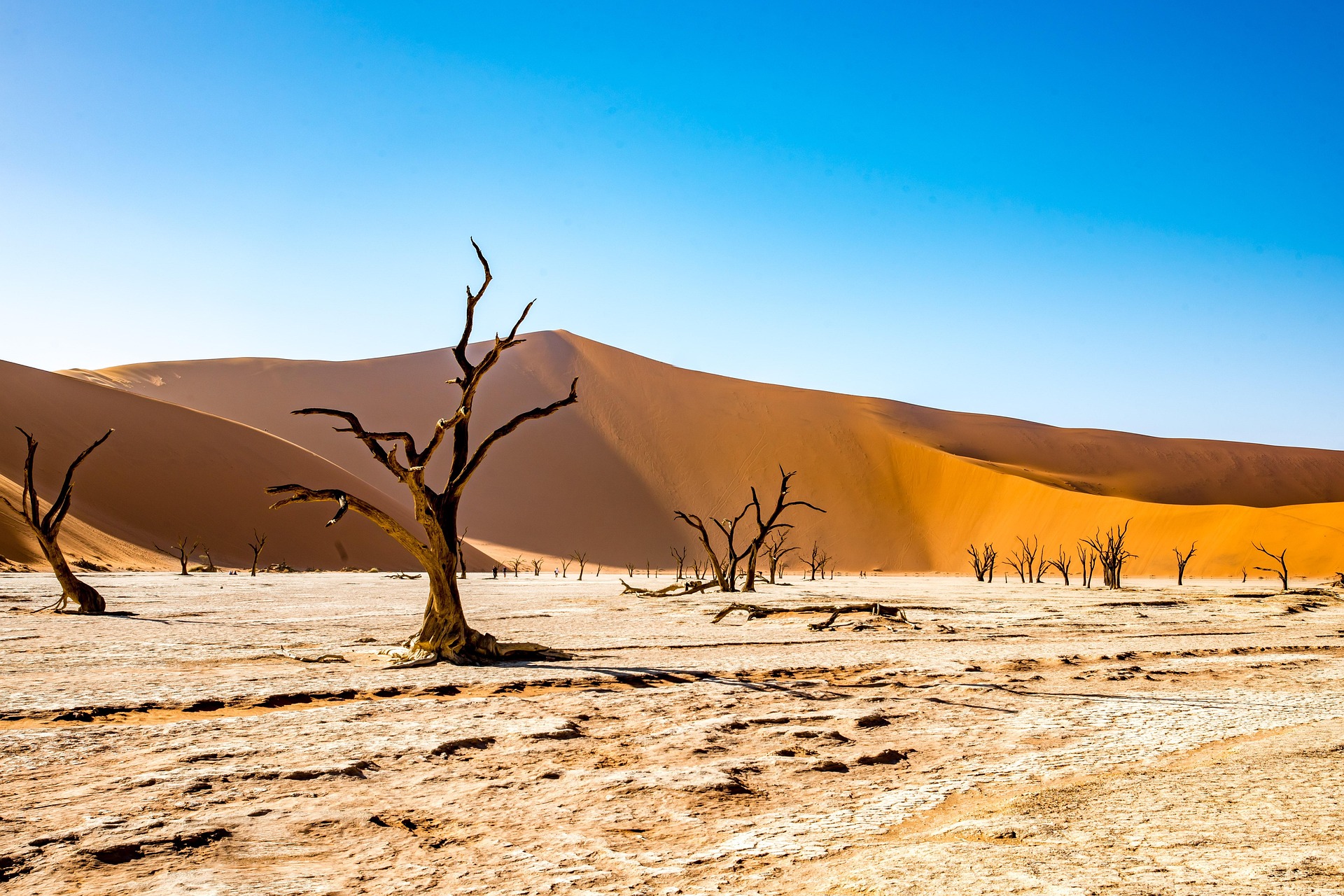 纳米比亚的苏索斯维利沙漠展现着地球最古老的记忆,八千万年的红色沙丘在晨光中如燃烧的火焰,枯死的骆驼刺树在死亡谷中定格成永恒雕塑。当驱车穿越埃托沙盐沼,粉红火烈鸟群在龟裂的地表上空掠过,长颈鹿家族在落日余晖中缓步走向水潭,这片看似荒芜的土地实则蕴藏着最顽强的生命力。